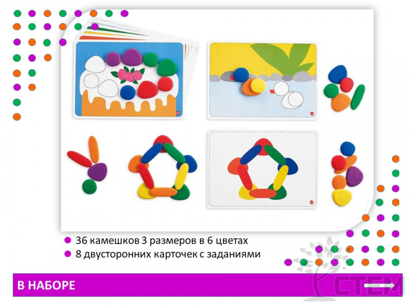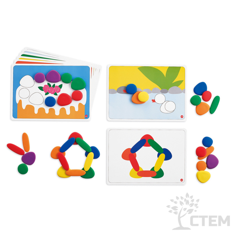 В наборе 36 камешков 3 размеров в 6 ярких цветах и 8 двусторонних карточек с заданиями.