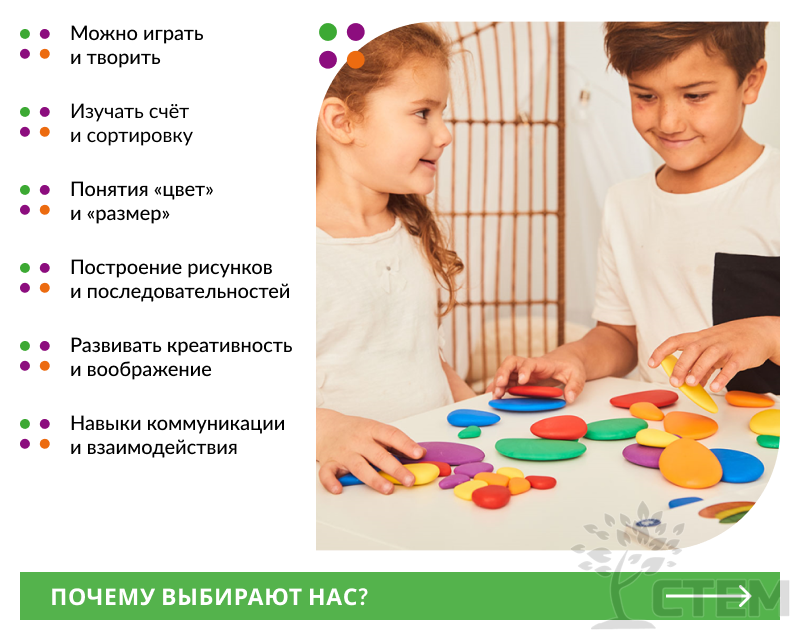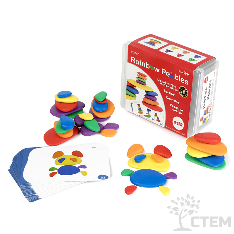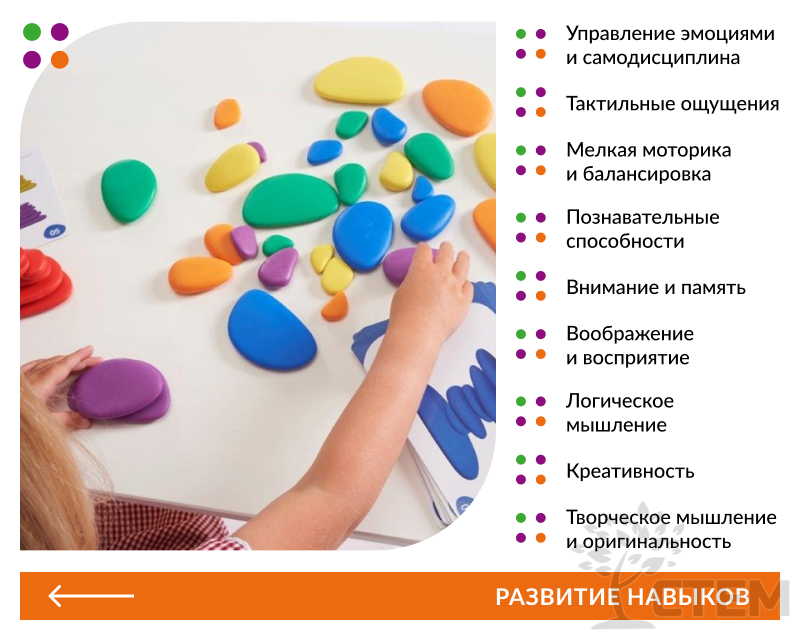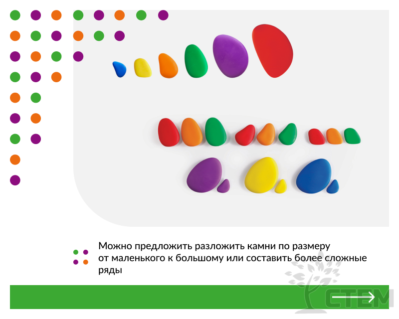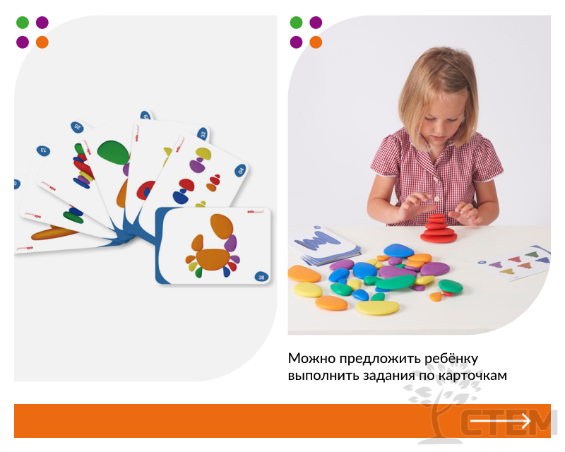 Набор состоит из 36 цветных камешков (6 размеров, 6 цветов) и 20-ти двусторонних карточек с заданиями.