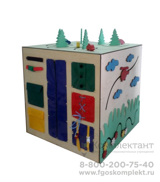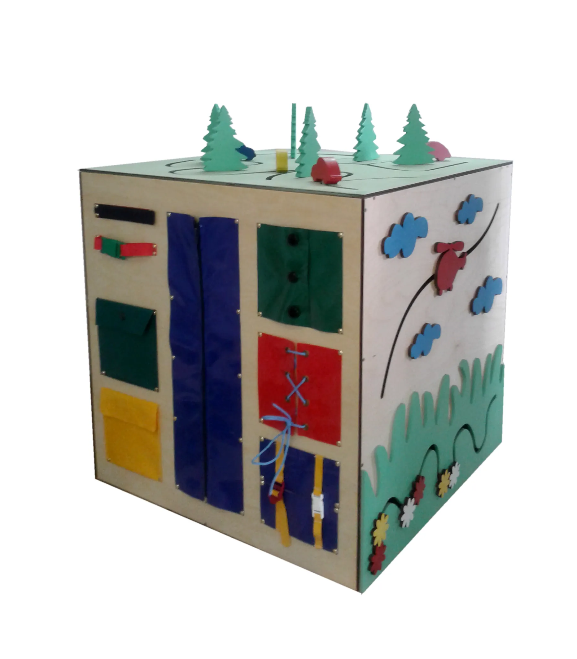 Изделие представляет собой кубик с пятью гранями, на которых расположены различные тактильные элементы: лабиринт с машинками и ёлочками, кармашки с застежками, застёжки на молниях, жалоба с фигурками, шестерёнки, песочные часы, штурвал, 3 трубки с гайками и шестеренками, трубка с магнитным песком и палочкой, трубка с разноцветными шариками.