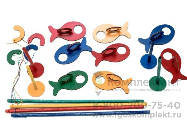 В комплект игрового пособия входят 4 удочки, 4 подставки «для улова» - нанизывания рыбок и 12 рыбок. Удочки, подставки и рыбки окрашены в синий, красный, жёлтый и зеленый цвета. Размеры игрушки: длина каждой - удочки 35 см, длина лески из шнура (или резинки) 30 см., ширина (высота) каждой из рыбок - 4,5 см., а длина-10см. Диаметр подставки 5.5см, длина штырька в подставке для нанизывания пойманных рыбок - 5,5см, диаметр удочки и штырька в подставке - по 8 мм.