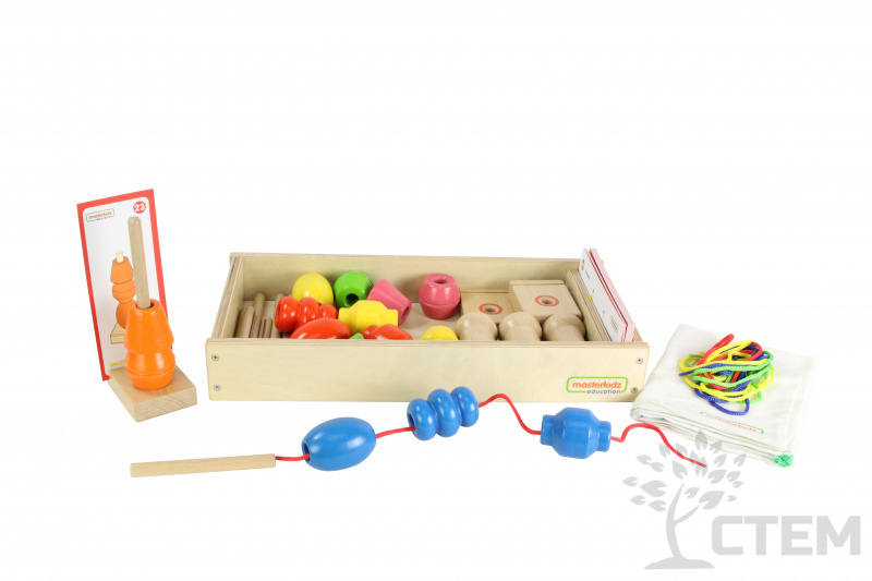 В набор пособия входят разноцветные бусинки разной формы, 4 стойки с резьбой для нанизывания бусинок, 8 двусторонних карточек (16 упражнений разной сложности) и разноцветные шнуровки. Для комплекта также предусмотрена тканевая сумка. Набор поставляется в прочном деревянном ящике для хранения.