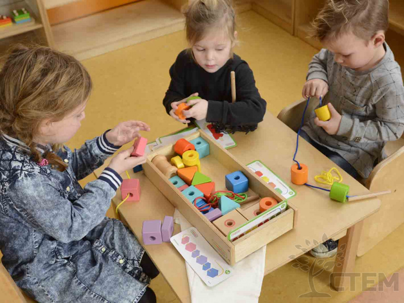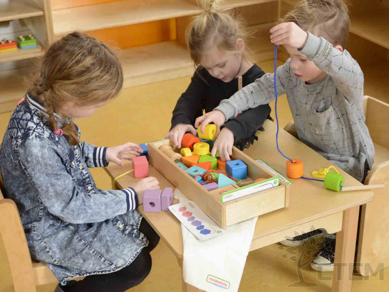 В набор входят разноцветные бусинки разной формы, 4 стойки с резьбой для нанизывания бусинок, 8 двусторонних карточек (16 упражнений разной сложности) и разноцветные шнуровки. Для комплекта также предусмотрена тканевая сумка. Набор поставляется в прочном деревянном ящике для хранения.