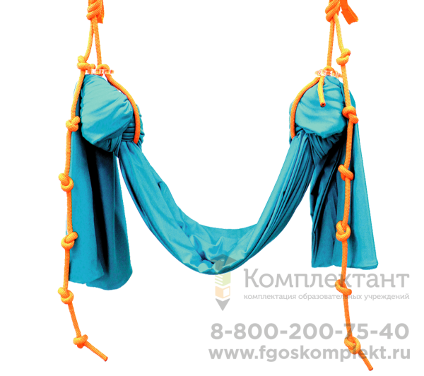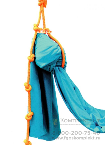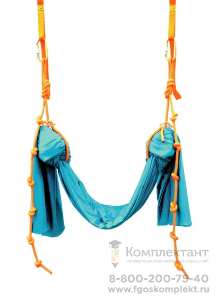 Используйте Cоволёт как необычные эластичные качели. Повесьте гамак в полуметре над полом, руками сформируйте из него плотный жгут. Ребёнок садится на жгут из гамака, надёжно берётся руками за ткань снаряда и раскачивается. Усложните задачу и предложите ребёнку раскачиваться стоя.