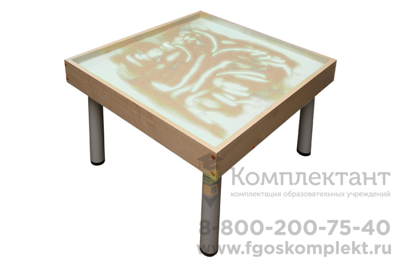 Столик представляет собой деревянный короб-планшет со светодиодными матрицами. Цвет подсветки: белый. В короб насыпается песок и распределяется равномерным слоем по прозрачному безопасному стеклу. Если на песке что-нибудь нарисовать – рисунок снизу будет подсвечен.