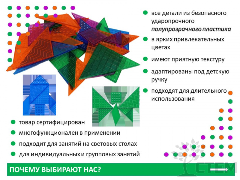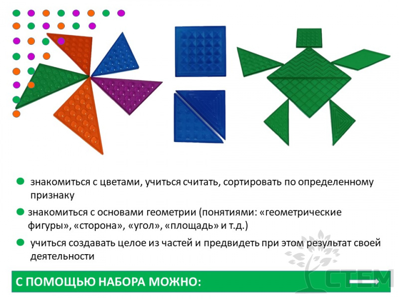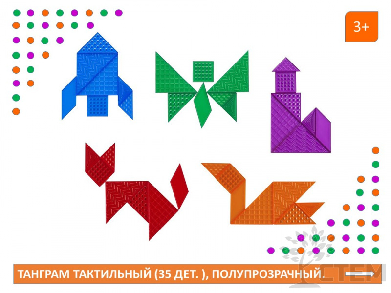 Предназначен для развития тактильного восприятия, воображения, логического мышления, усидчивости и внимания, помогает создавать целое из частей и предвидеть при этом результат своей деятельности, знакомит с основами геометрии (понятие площадь, фигура, угол, сторона и т.д.).