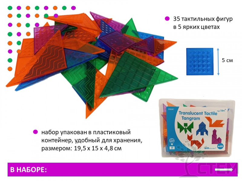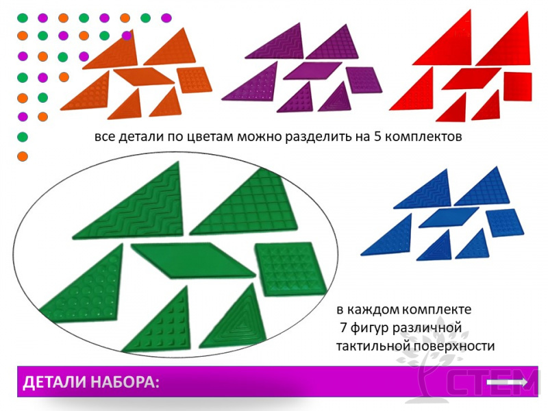 В комплект входят 35 тактильных фигур в 5-ти ярких цветах (7 различных тактильных поверхностей).