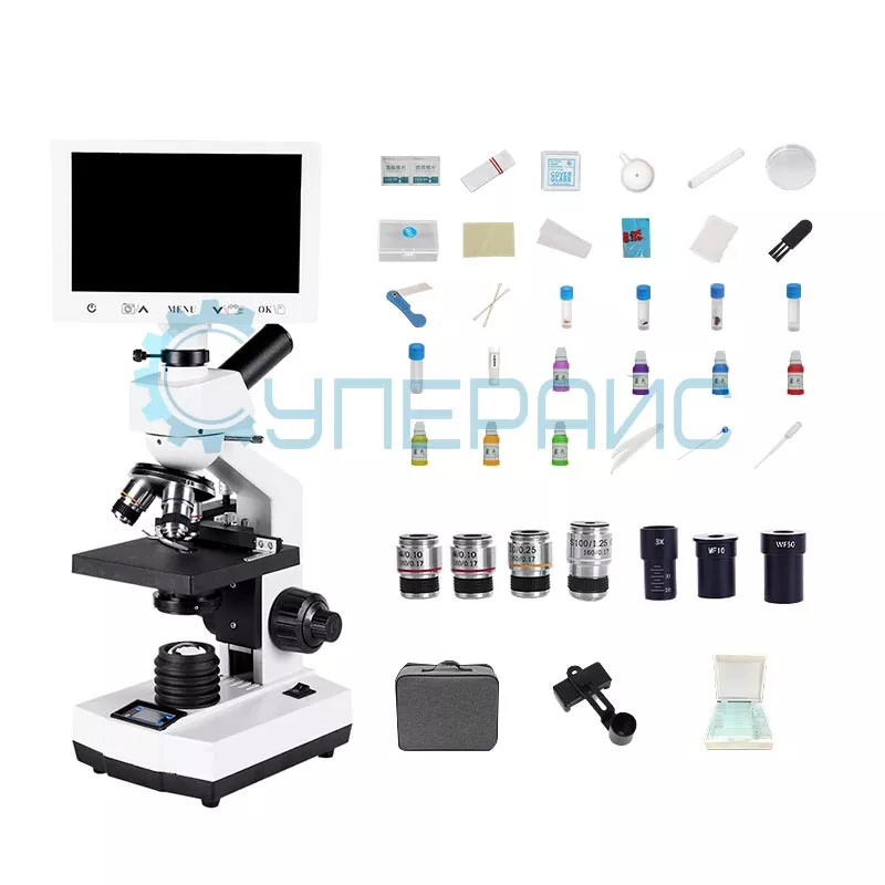дезинфицирующие салфетки - 1 шт предметные стекла - 1 набор покровные стекла - 1 набор пробирка - 1 шт чашка Петри - 1 шт пластиковая ёмкость - 1 шт тканевая салфетка - 1 шт абсорбирующая бумага - 1 комплект универсальные салфетки для чистки оптики - 1 шт щеточка - 1 шт ватные палочки - 2 шт ножик - 1 шт марлевая ткань - 1 шт флаконы с препаратами - 6 шт биологический краситель - 7 шт пинцет - 1 шт игла - 1 шт пипетка - 1 шт объектив 4x - 1 шт объектив 6x - 1 шт объектив 10x - 1 шт объектив 100x - 1 шт окуляр 3x – 1 шт окуляр 10x – 1 шт окуляр 50x – 1 шт сумка для переноски - 1 шт готовые микропрепараты - 30 шт адаптер для телефона - 1 шт дисплей - 1 шт |