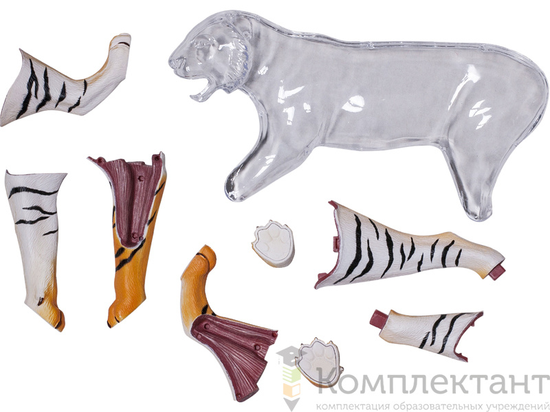Конструкция модели включает прозрачные элементы, позволяющие наблюдать расположение внутренних органов и костной структуры без необходимости разборки. Все 35 деталей являются полностью съемными, что обеспечивает поэлементное изучение анатомических систем тигра. Особое внимание уделено точному воспроизведению мышечной системы, скелета и внутренних органов, характерных для крупных хищников. Модель отличается высокой детализацией и реалистичностью исполнения.