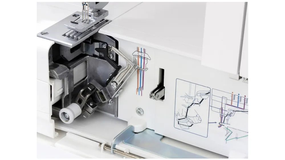 Janome Cover Pro 3000 Professional предлагает на Ваш выбор 6 видов встроенных швов, включая плоский шов с верхним застилом, 2-игольный узкий распошивальный, 2-игольный широкий распошивальный, 3-игольный распошивальный и цепной стежок. Для швов с верхним застилом предусмотрен встроенный направитель. Наличие рукавной платформы позволяет с комфортом обрабатывать элементы узких изделий. Обычную подсветку дополняет встроенная в верхнюю часть корпуса отдельная лампа, которая выдвигается при необходимости осветить место перед игольной пластиной.