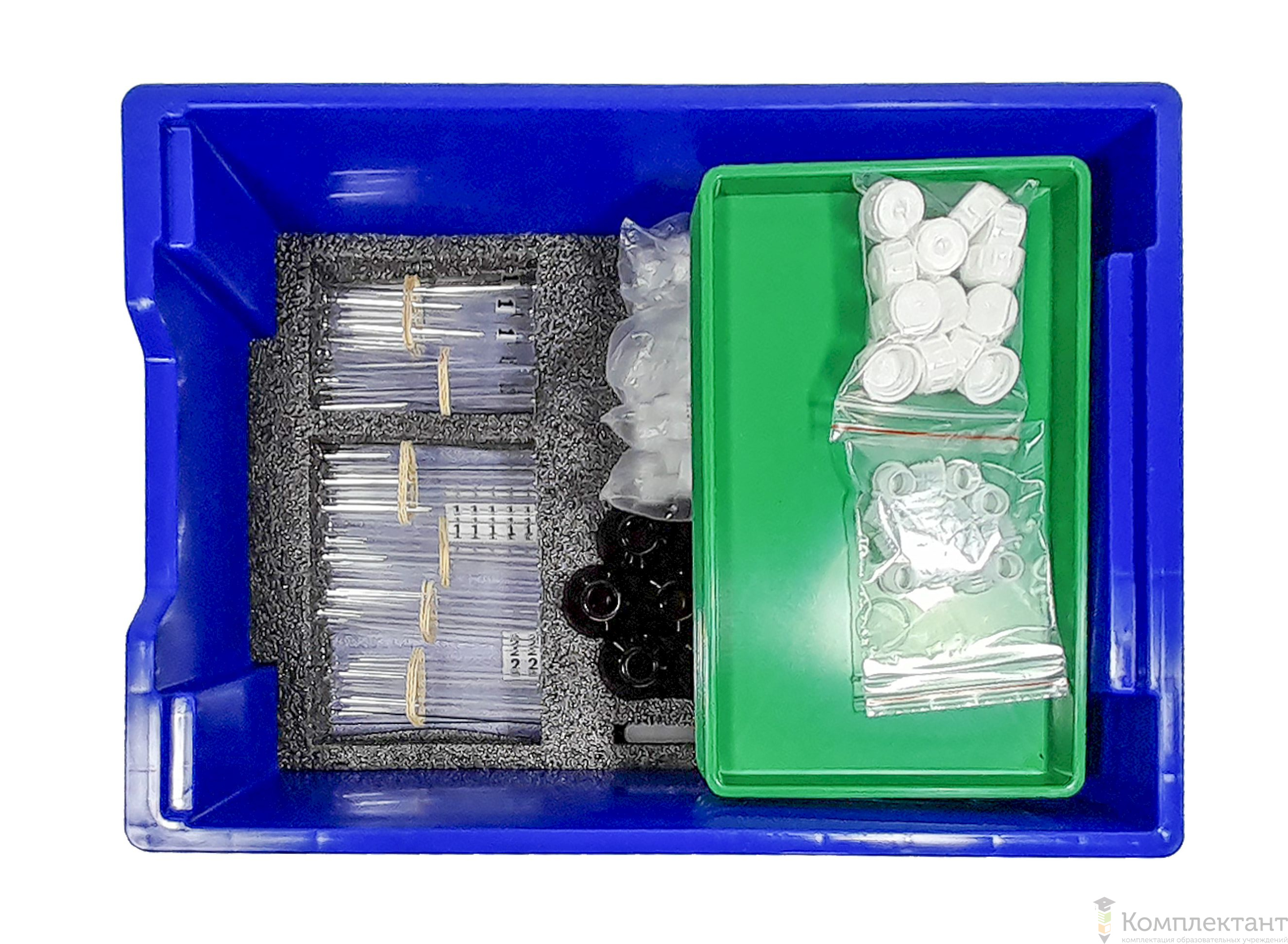 Набор реактивов укомплектован в пластиковую систему хранения с прозрачной пластиковой крышкой на защелках для обеспечения наблюдения за содержимым.