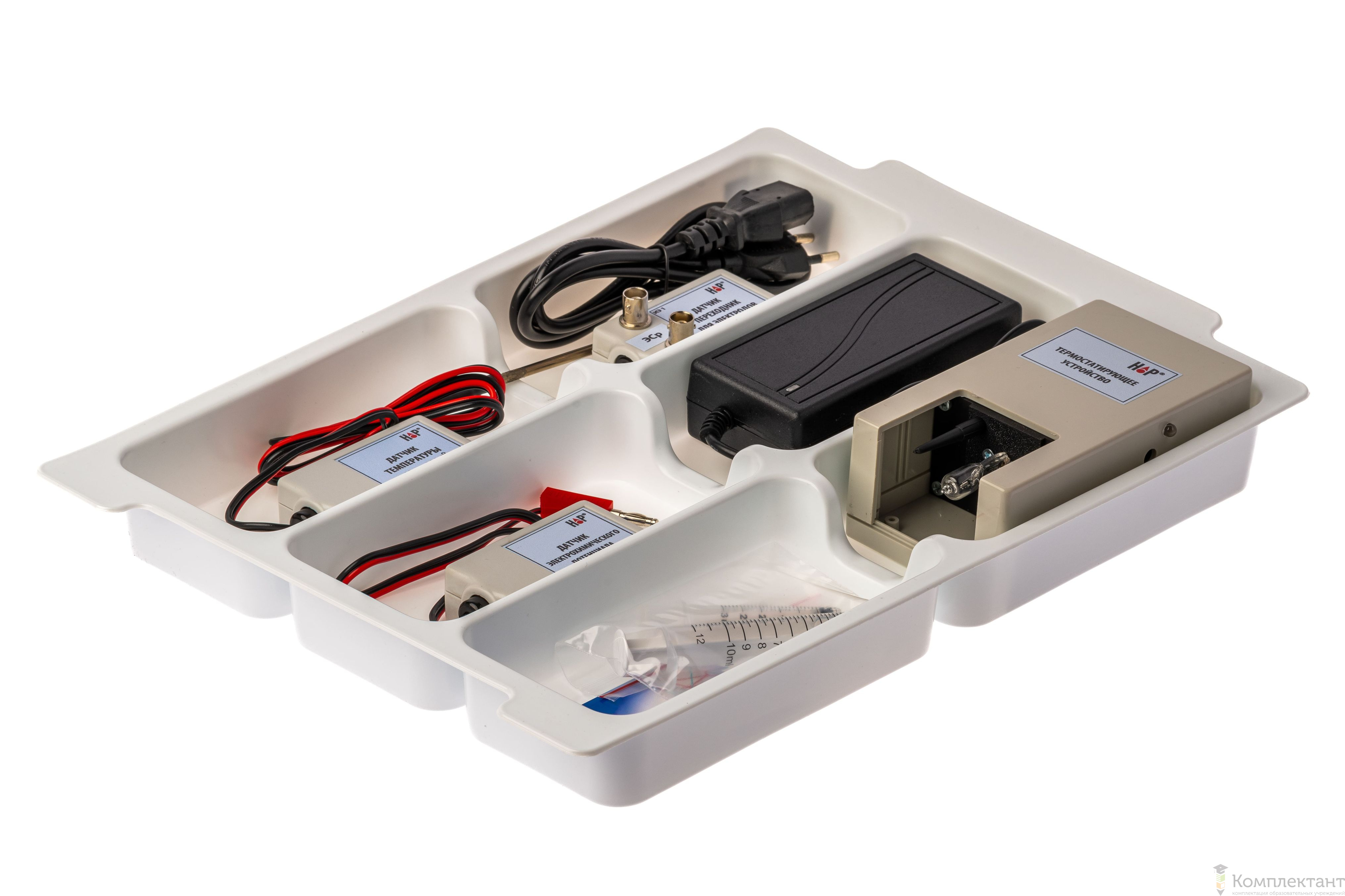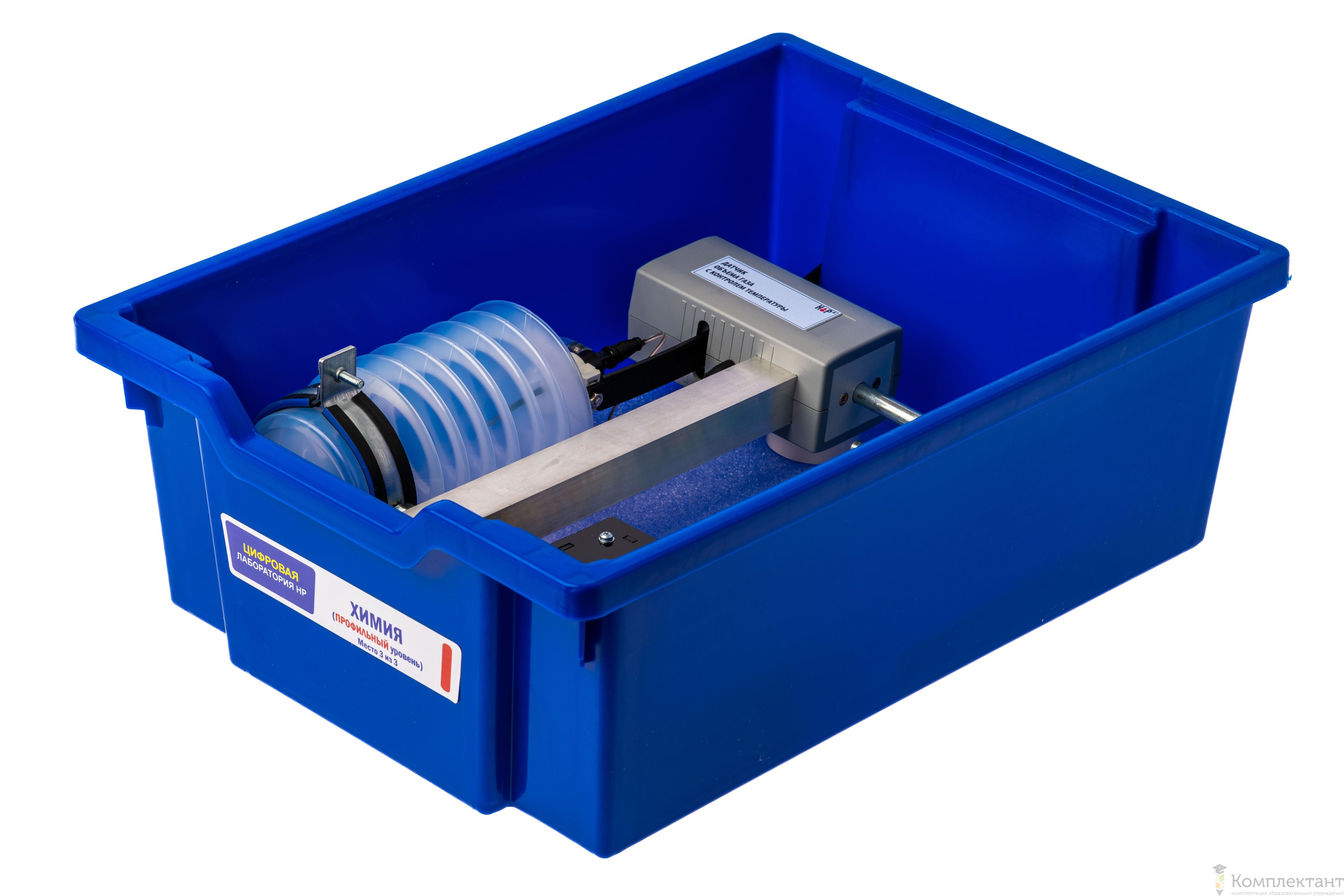 Цифровая лаборатория укомплектована в пластиковую систему хранения, которая закрывается прозрачной пластиковой крышкой на защелках для обеспечения наблюдения за содержимым. Комплект оборудования и датчики в системе хранения располагаются на ложементах.