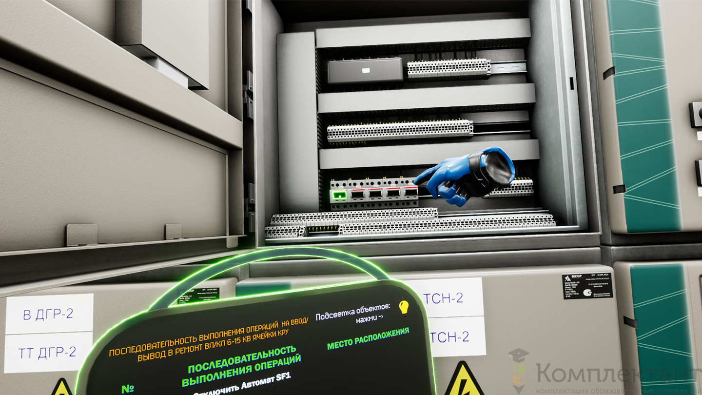 Виртуальный (VR) тренажер «Техническое обслуживание и ремонт электротехнического оборудования» предназначен для выработки у работников электросетевых предприятий устойчивых и надежных первичных профессиональных умений выполнения работ согласно перечню сценариев с использованием технологий виртуальной реальности, основанных на погружении обучаемого в приближенную к реальной ситуации виртуальную среду, обеспечивающей эффективное использование образной и памяти обучаемого.